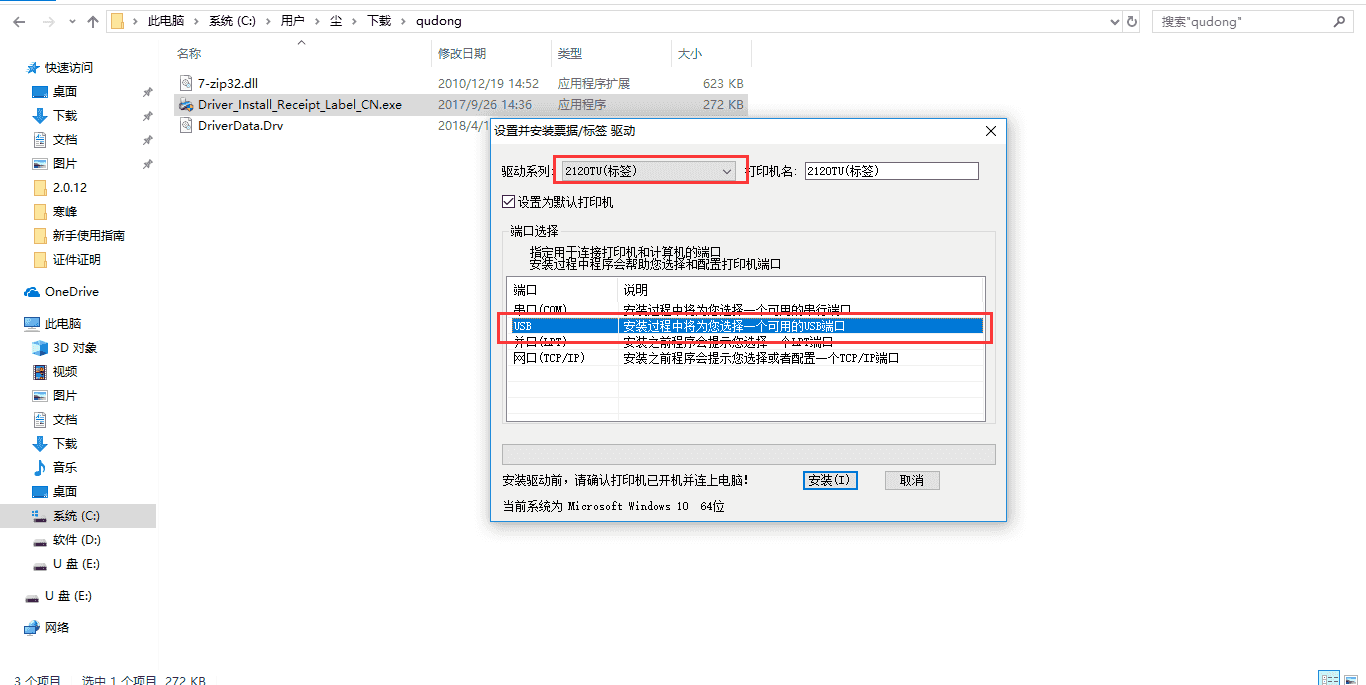 保存到本地以后,先解压,然后双击安装。如打印标签,驱动系列一栏选择2120TU(标签);如打印小票,驱动系列一栏选择2120TU(小票)。端口选择USB,点击安装。