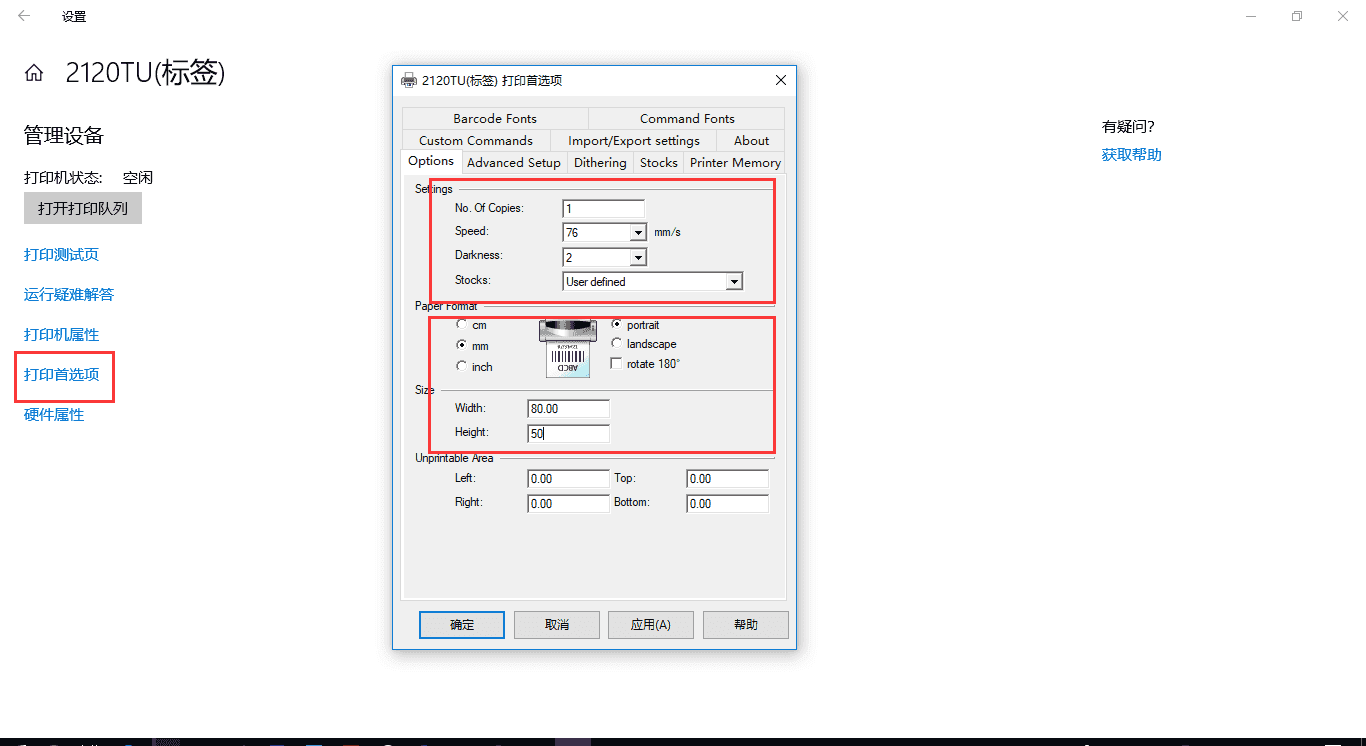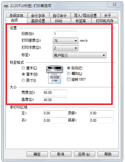 安装成功后,进入电脑系统中的打印机设置,设置打印参数(份数1,打印速度76,打印浓度2,标签:用户自定义,标签格式:毫米,纵向标签选纵向/横向标签选横向,高度和宽度根据标签实际尺寸填写,如60*40毫米标签,高度填40mm,宽度60mm)