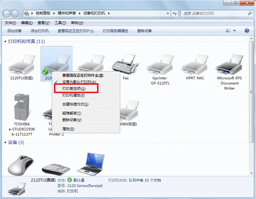 (2)Windows7系统设置方法:控制面板——设备和打印机——选择2120TU(标签)点击鼠标右键——打印首选项——设置参数(如图)——确定