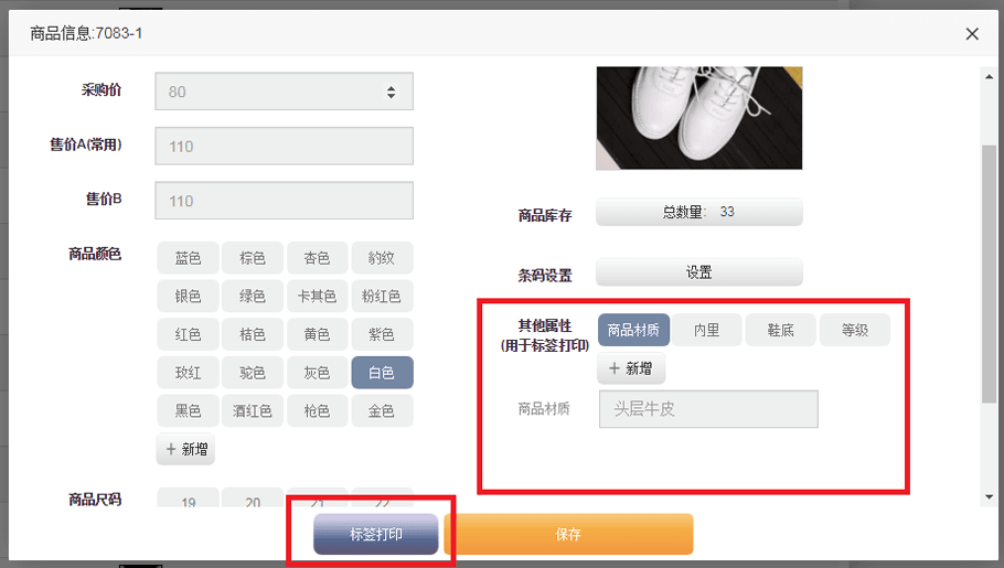 新增需要打印的商品属性(如材质、等级、品牌)——选中需要打印的属性